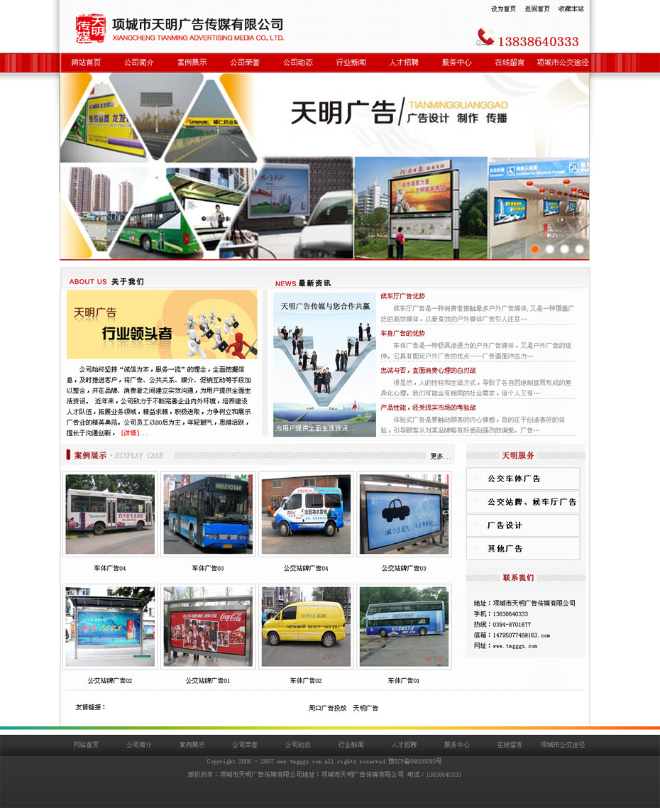 案例介紹:項(xiàng)城市天明廣告?zhèn)髅接邢薰境闪⒂?004年,前身為項(xiàng)城市公交公司廣告部。是專注于公交傳媒的專業(yè)戶外廣告公司,獨(dú)家擁有公交車傳媒資源200多臺、210多座公交候車亭燈箱、近300個公交站牌的廣告經(jīng)營發(fā)布權(quán),另有2000多平方的戶外大型廣告牌10余處。提供廣告設(shè)計(jì)、制作、發(fā)布、監(jiān)測、維護(hù)的一體化全程服務(wù)。